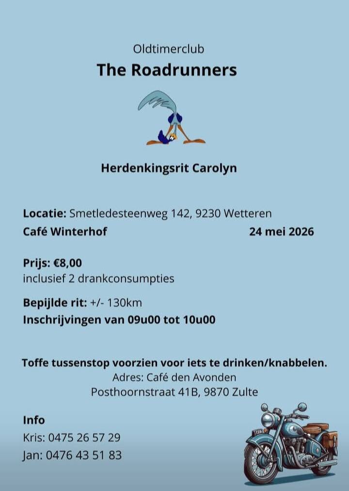 Zondag 24 Mei : The Roadrunners Wetteren. Cafe Winterhof Smetledestwg 142 9230 Wetteren. Tussen 9u & 10u inschrijven.